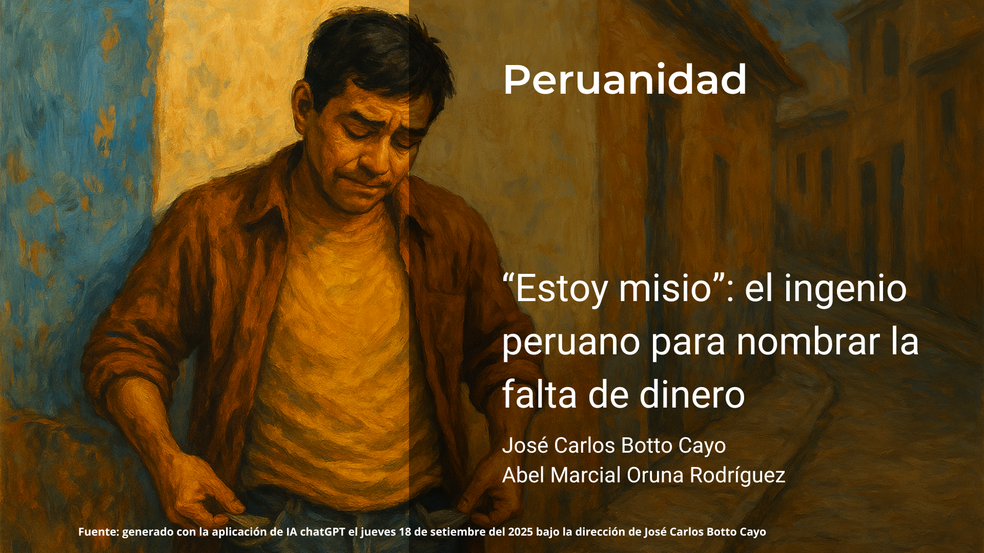 En la vastedad de la jerga peruana, hay expresiones que resumen con una claridad demoledora las vicisitudes de la vida diaria. Entre ellas, “estoy misio” se alza como una de las más emblemáticas. No se trata únicamente de un término para indicar la falta de dinero, sino de una manera de encarar la escasez con picardía, resignación y humor. La frase atraviesa generaciones y clases sociales, y se ha convertido en un signo de identidad cultural, en una clave compartida por millones de peruanos que entienden al instante lo que significa. Así, la pobreza ocasional o la estrechez económica adquieren una voz breve y contundente, que no necesita explicación porque todos saben lo que implica (Academia Española, 2014).